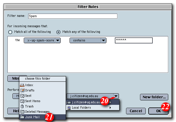 For example, if you wanted to consider anything with a score of 3 or more to be spam, the rule would look like: 'X-SpamDetect: ***'. Decreasing the number of asterisks will result in classifying more e-mails as spam. You may need to check your spam folder more carefully for non-spam e-mails that might have been classified as spam. If you wanted to rate anything with a score of 8 or greater as spam, the rule would look like: 'X-SpamDetect: ********'. Increasing the number of asterisks may result in fewer filtered e-mails being classified as spam and more potential spam staying in your Inbox.